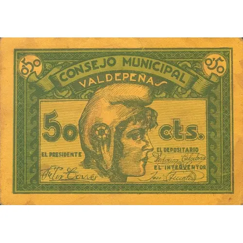 | 正面铭文 | 0`50 CONSEJO MUNICIPAL VALDEPEÑAS 50 cts. (Translation: Municipal Council Valdepeñas 50 Centimos) |