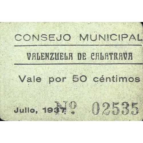 CONSEJO MUNICIPAL VALENZUELA DE CALATRAVA Vale por 50 céntimos Julio, 1937 (Translation: Municipal Council Valenzuela de Calatrava Valid for 50 Centimos July, 1937) |