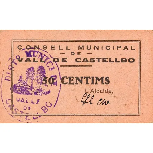 CONSELL MUNICIPAL DE VALL DE CASTELLBO 50 CENTIMS (Translation: Municipal Council of Vall de Castellbo 50 Centimos) |