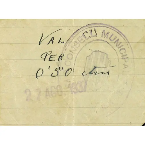 VAL PER 0`50 ctms MUNICIPAL COUNCIL - VALLALTA DEL MARESME 27 AGO. 1937 (Translation: Voucher for 50 Centimos Municipal Council - Vallalta del Maresme August 27, 1937) |