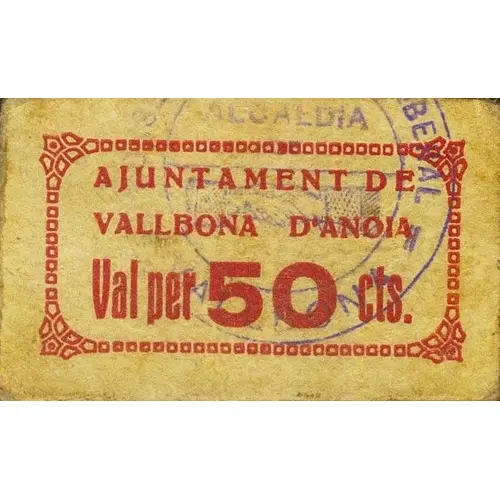 AJUNTAMENT DE VALLBONA D`ANOIA Val per 50 cts. (Translation: City Council of Vallbona d`Anoia Valid for 50 Centimos) |