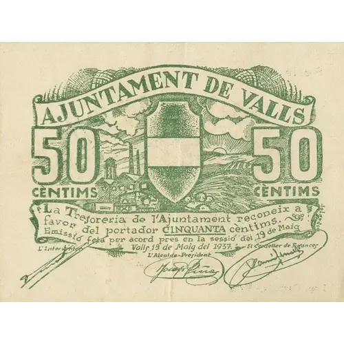 AJUNTAMENT DE VALLS 50 CÈNTIMS La Tresoreria de l`Ajuntament reconeix a favor del portador CINQUANTA cèntims Emissió feta per acord pres en la sessió del 19 de Maig. Valls 19 de Maig del 1937. (Translation: City Council of Valls 50 Centimos The treasury of the City Council recognizes in favor of the bearer Fifty Centimos Issue made by agreement taken in the session of May 19. Valls May 19, 1937) |