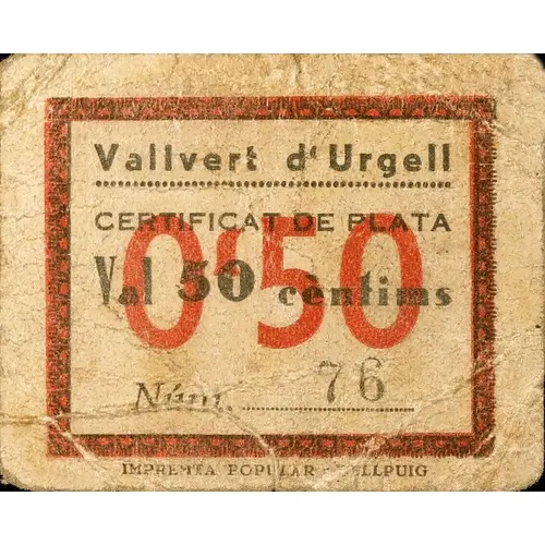 0`50 Vallvert d`Urgell CERTIFICAT DE PLATA Val 50 cèntims IMPREMTA POPULAR - BELLPUIG (Translation: Vallvert d`Urgell Silver Certificate It`s worth 50 Centimos) |