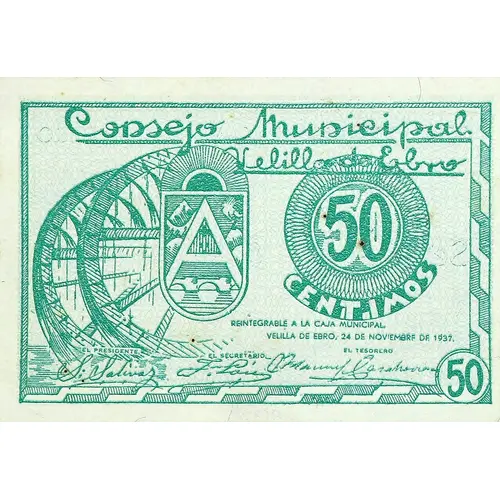 Consejo Municipal Velilla de Ebro 50 CENTIMOS REINTEGRABLE A LA CAJA MUNICIPAL VELILLA DE EBRO, 24 DE NOVIEMBRE DE 1937 (Translation: Municipal Council of Velilla de Ebro 50 Centimos Reintegrable to the Municipal Fund Velilla de Ebro, November 24, 1937) |