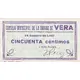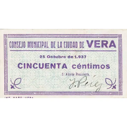 CONSEJO MUNICIPAL DE LA CIUDAD DE VERA 25 Octubre 1.937 CINCUENTA céntimos (Translation: Municipal Council of the City of Vera October 25, 1937 Fifty Centimos) |