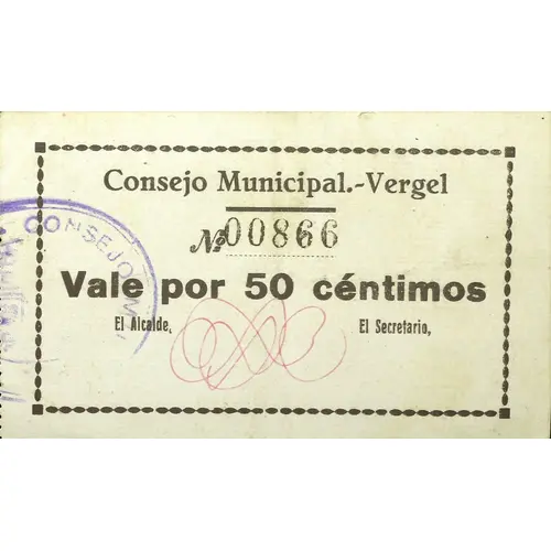 Consejo Municipal. - Vergel Vale por 50 céntimos (Translation: Municipal Council. - Vergel Valid for 50 Centimos) |