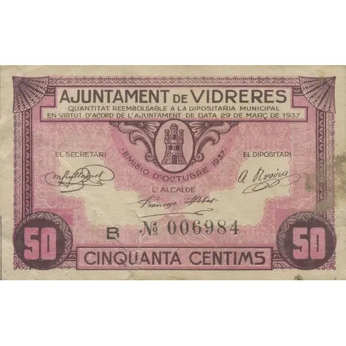AJUNTAMENT DE VIDRERES QUANTITAT REEMBOLSABLE A LA DIPOSITARIA MUNICIPAL EN VIRTUT D`ACORD DE L`AJUNTAMENT DE DATA 29 DE MARÇ DE 1937 EMISIO D`OCTUBRE 1937 CINQUANTA CENTIMS (Translation: City Council of Vidreres Amount repayable to the Municipal Depository, by virtue of the agreement of the City Council dated March 29, 1937 Issue October 1937 Fifty Centimos) |