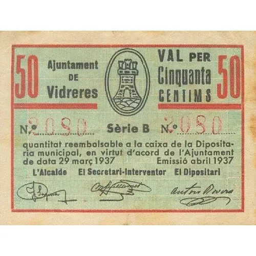 Ajuntament de Vidreres VAL PER Cinquanta CENTIMS quantitat reembolsable a la caixa de la Dipositaria municipal, en virtut d`acord de l`Ajuntament de data 29 de març 1937. Emissió abril 1937. (Translation: City Council of Vidreres Valid for Fifty Centimos amount repayable to the Treasury of the Municipal Depository, by virtue of the agreement of the City Council dated March 29, 1937. Issue April 1937.) |