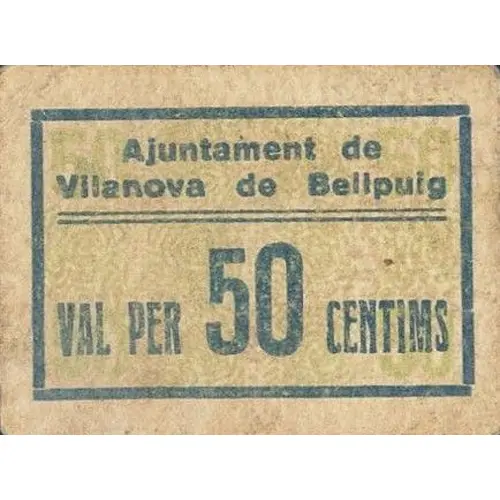 Ajuntament de Vilanova de Bellpuig VAL PER 50 CENTIMS (Translation: City Council of Vilanova de Bellpuig Valid for 50 Centimos) |