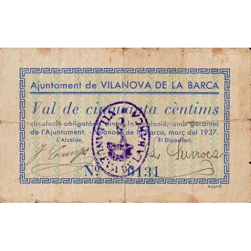 Ajuntament de VILANOVA DE LA BARCA Val de cinquanta cèntims circulació obligatòria dintre la població, amb garantia de l`Ajuntament. Vilanova de la Barca, març del 1937. (Translation: City Council of Vilanova de la Barca It is worth Fifty Centimos mandatory circulation within the town, guaranteed by the City Council. Vilanova de la Barca, March 1937.) |