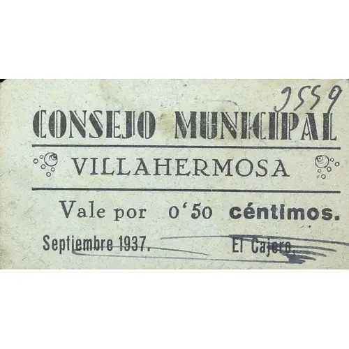 CONSEJO MUNICIPAL VILLAHERMOSA Vale por 0`50 céntimos. Septiembre 1937 (Translation: Municipal Council Villahermosa Voucher for 0.50 Centimos September, 1937) |