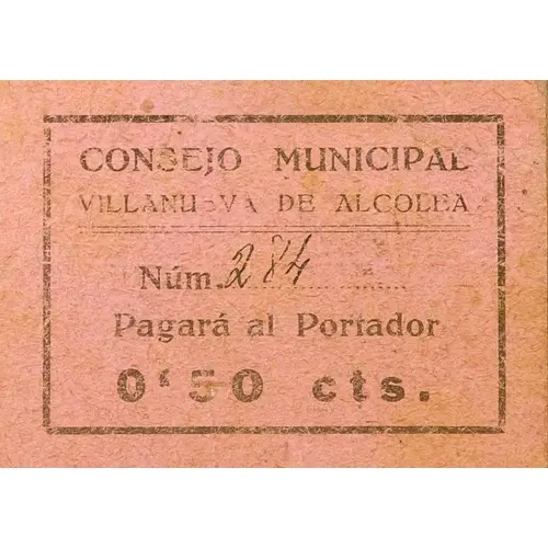 (Translation: Municipal Council Villanueva de Alcolea Will pay the bearer 0.50 Centimos)