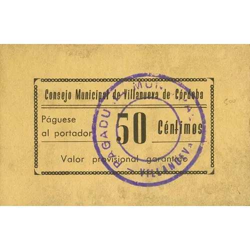 Consejo Municipal de Villanueva de Córdoba Páguese al portador 50 Céntimos Valor provisional garantido (Translation: Municipal Council of Villanueva de Córdoba Pay the bearer 50 Centimos Guaranteed provisional value) |