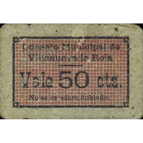 Consejo Municipal de Villanueva la Roja Vale 50 cts. No es valedero doblado. (Translation: Municipal Council of Villanueva la Roja It`s worth 50 Centimos Folded is not valid) |