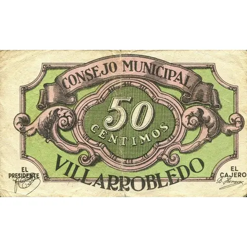 50 Cts. / CENTIMOS PAGARA AL PORTADOR EN BILLETES DEL BANCO DE ESPAÑA VILLARROBLEDO 20 SEPTIEMBRE 1937 (Translation: 50 Centimos Will pay the bearer in banknotes of the Bank of Spain Villarrobledo September 20, 1937) |