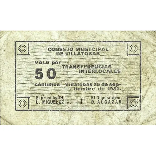 CONSEJO MUNICIPAL DE VILLATOBAS VALE por 50 céntimos TRANSFERENCIAS INTERLOCALES Villatobas 25 de septiembre de 1937. (Translation: Municipal Council of Villatobas Voucher for 50 Centimos Interlocal transfers Villatobas September 25, 1937.) |