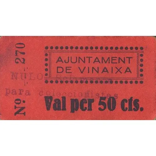 AJUNTAMENT DE VINAIXA Val per 50 cts. (Translation: City Council of Vinaixa Valid for 50 Centimos) |