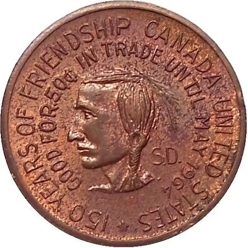 | Obverse lettering | 150 YEARS FRIENDSHIP CANADA UNITED STATES GOOD FOR 50¢ IN TRADE UNTIL MAY 1964 S.D. |