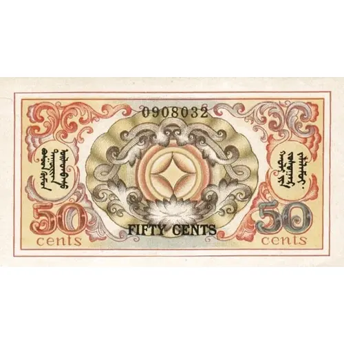 ᠪᠤᠰᠤᠳ ᠬᠦᠮᠦᠨ ᠳᠠᠭᠤᠷᠢᠶᠠᠨ ᠦᠢᠯᠡᠳᠪᠡᠰᠦ ᠬᠠᠤᠯᠢ ᠶᠣᠰᠣᠭᠠᠷ ᠢᠯᠠᠯᠤᠮᠤᠢ FIFTY CENTS (Translation: Anyone who counterfeit will be prosecute by law) |