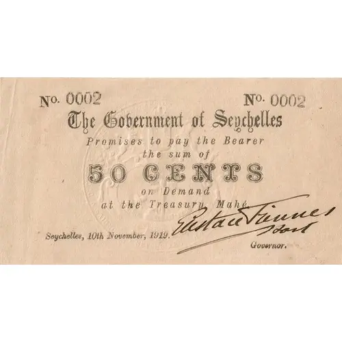 | 正面铭文 | The Goverment of Seychelles Promises to pay the Bearer the sum of 50 CENTS on Demand at the Treasury, Mahé Seychelles, 10th November, 1919. |