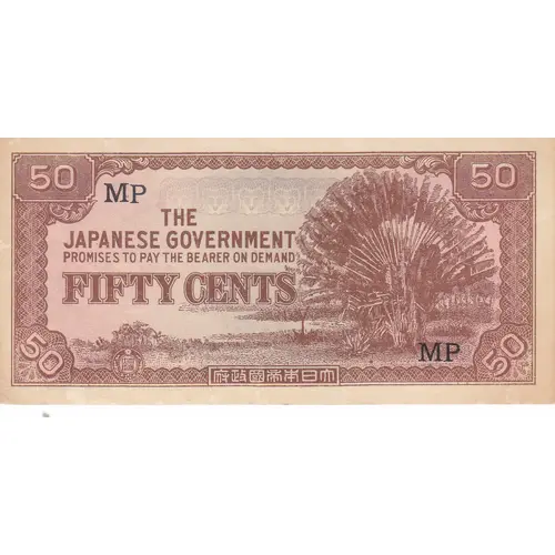 | Obverse description | THE JAPANESE GOVERNMENT PROMISES TO PAY THE BEARER ON DEMAND FIFTY CENTS 府政國帝本日大 |
