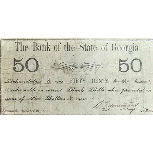 | Obverse lettering | The Bank of the State of Georgia 50 Acknowledges to owe FIFTY CENTS to the bearer, `redeemable in current Bank Bills when presented in sums of Five Dollars or more.` Savannah, December 10, 1861. Cashier |