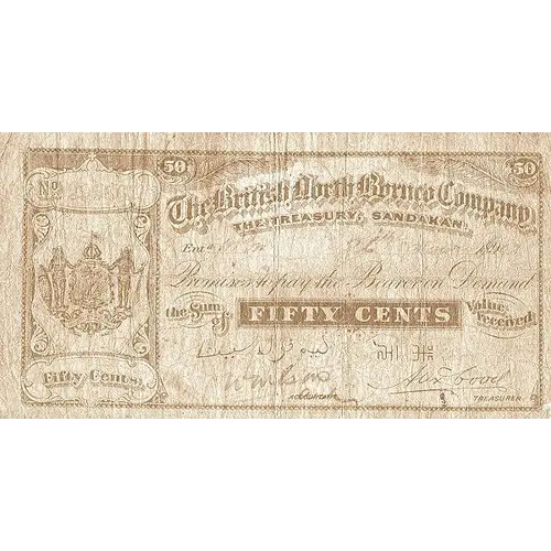 | Obverse lettering | The British North Borneo Company THE TREASURY, SANDAKAN. Promises to pay the Bearer on Demand the Sum of TWENTY FIVE CENTS Value recived 半元 |