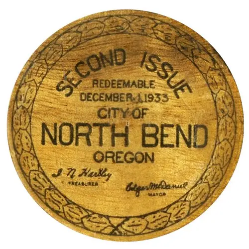 | Obverse lettering | SECOND ISSUE REDEEMABLE DECEMBER 1, 1933 CITY OF NORTH BEND OREGON I N HARTLEY TREASURER EDGAR McDANIEL MAYOR |