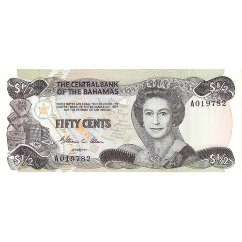 THE CENTRAL BANK OF THE BAHAMAS THESE NOTES ARE LEGAL TENDER UNDER THE CENTRAL BANK OF THE BAHAMAS ACT 1974 FOR THE PAYMENT OF ANY AMOUNT FIFTY CENTS Governor $1/2 |