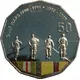 Four Australian Soldiers shoulder to shoulder walking down a straight road with weapons ready. Set above a colored military ribbon. |