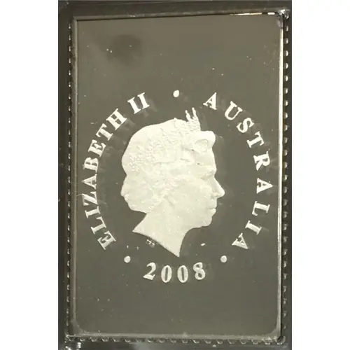 Stamp shaped coin. Top half silver with colored Australian Flag above colored Olympic Rings and 50c in lower left corner. Bottom half colored with Chinese Dragon, AUSTRALIA written vertically down right side with solid red strip, and Beijing 2008 written above the dragon. |