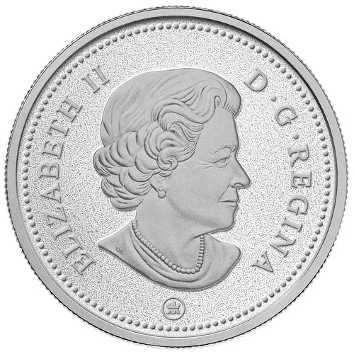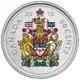 Created by Canadian engraver Thomas Shingles, the design on the reverse represents the Canadian coat of arms. To the left of the shield, a lion holds the Union Jack, while to the right of the shield, a unicorn carries a flag adorned with three fleurs-de-lis. The shield is divided into five sections bearing the historic emblems of England, France, Scotland and Ireland, as well as a sprig of three maple leaves, and is encircled by a ribbon bearing the motto of the Order of Canada: Desiderantes meliorem patriam (They desire a better country). Above the shield is a royal helmet surrounded by a garland of maple leaves, and the helmet`s crest is surmounted by a crowned lion holding a maple leaf. Above the lion, symbolizing Canada`s sovereignty, is the Crown of St. Edward, representing Canada`s constitutional monarchy. At the base of the shield is a ribbon bearing the motto A Mari usque ad Mare (From Sea to Sea), and a garland composed of the floral emblems of England, Scotland, France and Ireland. The coat of arms is colorful. |