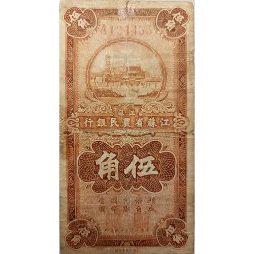 | 背面铭文 | KIANGSU THE KIANGSU FARMERS` BANK TWO 50 CENTS TO BE EXCHANGED ONE DOLLAR 50 CENTS FIFTY CENTS GOVERNOR MANAGER 1936 |