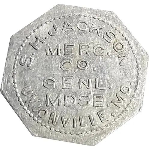 | نوشتههای روی توکن | S.H. JACKSON MERC. CO. GENL. MDSE. UNIONVILLE, MO. |