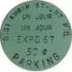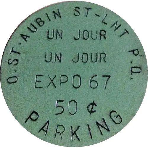 | Obverse lettering | O. ST·AUBIN ST-LNT P.Q. UN JOUR UN JOUR EXPO 67 50¢ PARKING |