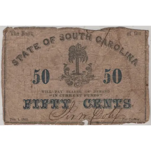 | Obverse lettering | STATE OF SOUTH CAROLINA 50 50 WILL PAY BEARER ON DEMAND `IN CURRENT FUNDS` FIFTY CENTS |