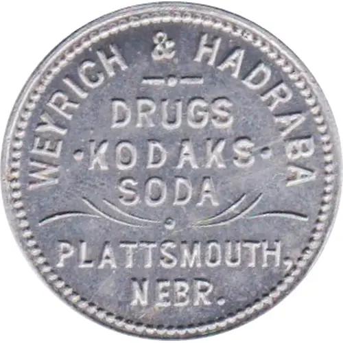 | Obverse lettering | WEYRICH & HADRABA DRUGS KODAKS SODA PLATTSMOUTH, NEBR. |