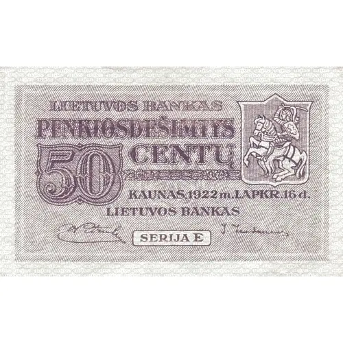 | Chữ khắc mặt trước | LIETUVOS BANKAS PENKIOSDEŠIMT CENTŲ KAUNAS, 1922 m. LAPKR 16 d. SERIJA E (Translation: Lithuanian Bank Fifty centu Kaunas, November 16, 1922.) |