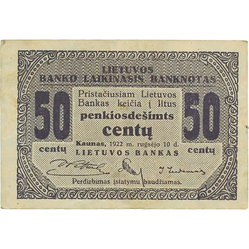 | Obverse lettering | LIETUVOS BANKO LAIKINASIS BANKNOTAS Pristačiusiam Lietuvos Bankas keičia i litus penkiosdešimts centų Kaunas, 1922 m. rugsejo 10 d Padirbimas Istatymu Baudziamas (Translation: Lithuanian Bank Provisional Banknote The Bank of Lithuania exchanges litas for the delivery person Fifty cents Kaunas, September 10, 1922 Counterfeiting is punishable by law) |