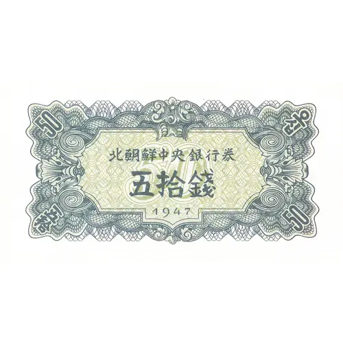 | Legenda do anverso | 北朝鮮中央銀行券 五拾 錢 1947 (Translation: Banknote of the Central Bank of North Korea Fifty Chon) |