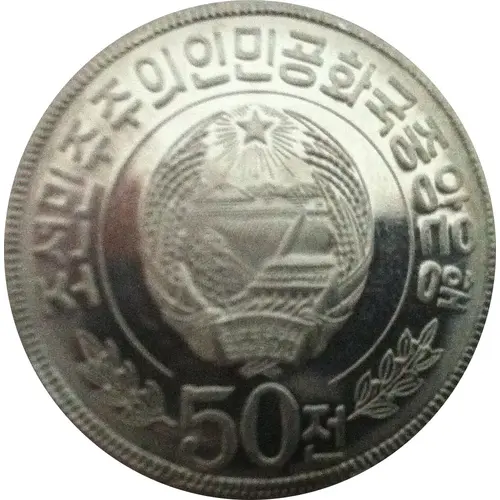 Artistry: While specific engraver details remain undisclosed, typical for state-controlled mints, the coin's design adheres to the tenets of Socialist Realism, a prevalent artistic school in the DPRK. The obverse prominently features the emblem of the Workers' Party of Korea—a hammer, sickle, and writing brush—symbolizing the unity of workers, peasants, and intellectuals. This powerful iconography is rendered with strong, clear lines, emphasizing national pride and the collective spirit of labor, characteristic of North Korean numismatic art of the era.