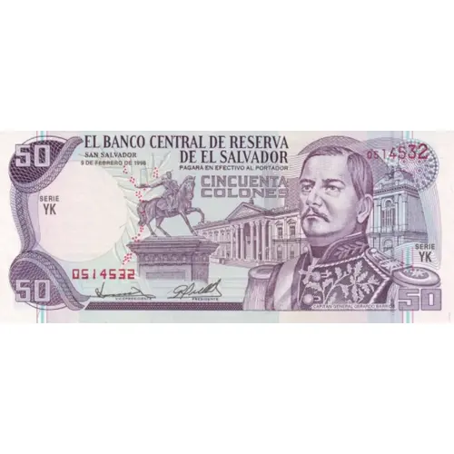 | Reverse lettering | EL BANCO CENTRAL DE RESERVA DE EL SALVADOR 50 CINCUENTA COLONES (Translation: The Central Reserve Bank of El Salvador Fifty Colons) |