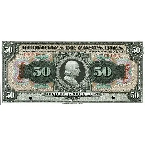 REPÚBLICA DE COSTA RICA LA ADMINISTRACIÓN DE RENTAS PUBLICAS PAGARÁ AL PORTADOR LA SUMA DE 50 San José de Costa Rica de de 19 EL MINISTRO DE HACIENDA. EL ADMINISTRATOR PRINCIPAL. CINCUENTA COLONES EN MONEDA ACUÑADA DE PLATA AMERICAN BANK NOTE COMPANY |