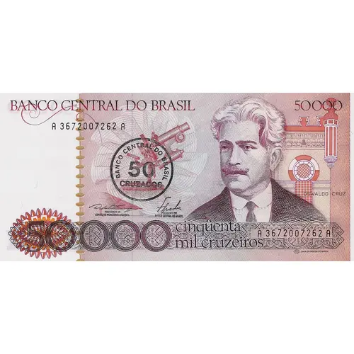 | Obverse lettering | BANCO CENTRAL DO BRASIL 50 000 BANCO CENTRAL DO BRASIL 50 CRUZADOS OSWALDO CRUZ PRESIDENTE DO CONSELHO MONETÁRIO NACIONAL PRESIDENTE DO BANCO CENTRAL DO BRASIL 50 000 cinqüenta mil cruzeiros CASA DA MOEDA DO BRASIL (Translation: 50 000 Central Bank of Brazil Central Bank of Brazil 50 Cruzados Oswaldo Cruz President of the National Monetary Council President of the Central Bank of Brazil 50 000 Fifty Thousand Cruzeiros Brazilian Mint) |