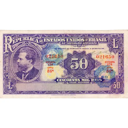 | Reverse lettering | REPUBLICA DOS ESTADOS UNIDOS DO BRASIL 50 L CINCOENTA MIL REIS L 50 WATERLOW & SONS LIMITED, LONDRES. (Translation: Republic of the United States of Brazil Fifty Thousand Réis Waterlow & Sons Limited, Londres.) |