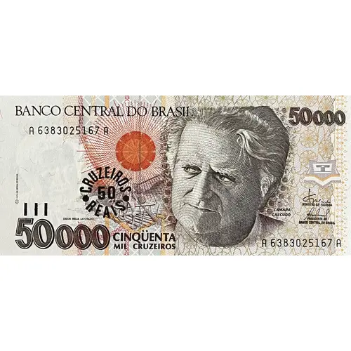 | Obverse lettering | BANCO CENTRAL DO BRASIL 50 000 CASA DA MOEDA DO BRASIL 50 CRUZEIROS REAIS DEUS SEJA LOUVADO CÂMARA CASCUDO MINISTRO DA ECONOMIA, FAZENDA E PLANEJAMENTO PRESIDENTE DO BANCO CENTRAL DO BRASIL 50 000 CINQÜENTA MIL CRUZEIROS (Translation: Central Bank of Brazil 50 000 Brazilian Mint 50 Cruzeiros Reais God Be Praised Câmara Cascudo Minister of Economy, Finance and Planning President of the Central Bank of Brazil Fifty Thousand Cruzeiros) |