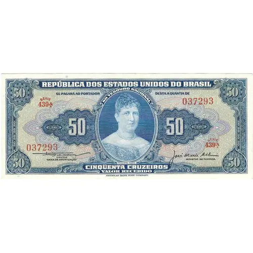 REPÚBLICA DOS ESTADOS ESTADOS UNIDOS DO BRASIL SE PAGARÁ AO PORTADOR DESTA A QUANTIA DE CINQÜENTA CRUZEIROS 50 NO TESOURO NACIONAL 50 PRINCESA ISABEL DIRETOR CAIXA DE AMORTIZAÇÃO MINISTRO DA FAZENDA VALOR RECEBIDO AMERICAN BANK NOTE COMPANY. (Translation: Republic of United States of Brazil will be paid to the carrier of this amount of twenty Cruzeiros in the National Treasury Princess Isabel Director of Amortization Fund Finance Minister Amount Received American Bank Note Company.) |