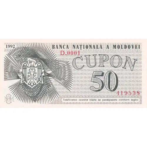| Obverse lettering | 1992 BANCA NATIONALA A MOLDOVEI CUPON 50 Falsificarea acestor bilete se pedepseste conform legilor |