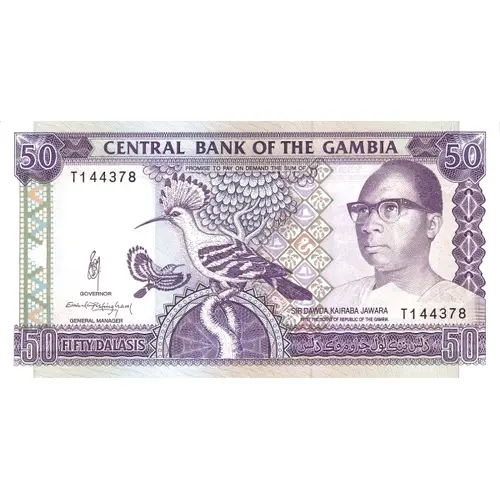 | Obverse lettering | Central Bank of the Gambia Promise to pay on demand the sum of Fifty Dalasis Sir Dawda Kairaba Jawara First President of Republic of the Gambia |