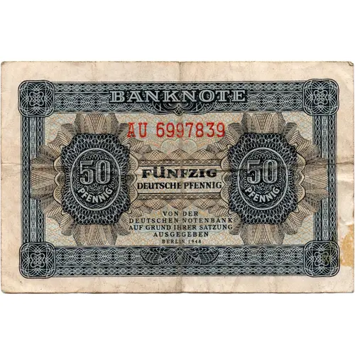 | Chữ khắc mặt trước | BANKNOTE FÜNFZIG DEUTSCHE PFENNIG VON DER DEUTSCHEN NOTENBANK AUF GRUND IHRER SATZUNG AUSGEGEBEN BERLIN 1948 (Translation: Banknote Fifty Deutschpfennigs Issued by the German Notesbank Based on their Statues Berlin 1948) |